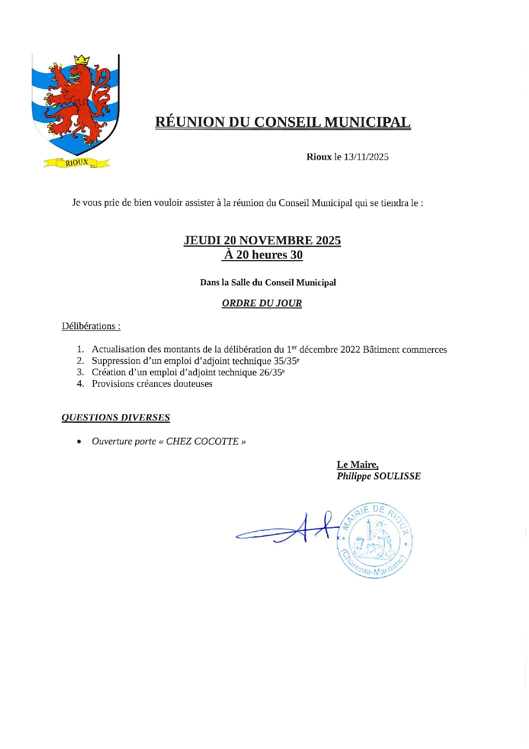 Actualités de Rioux RÉUNION CONSEIL MUNICIPAL LE 20 NOVEMBRE 2025 CYCLAD – COLLECTE DES DÉCHETS JOURS FÉRIÉS CINÉ CLUB GÉMOZAC LE 21 NOVEMBRE 2025 ASDPR – CONFÉRENCE DE MR PETIT LE 15/11/2025 ENEDIS – COUPURE DE COURANT LE 3 DÉCEMBRE 2025 EHPAD DE CRAVANS – FORMATIONS GRATUITES POUR LES AIDANTS FAMILIAUX ARS – CONTRÔLE SANITAIRE DES EAUX À RIOUX PASS CYCLAD SIMULATEUR TAXES D’URBANISME LISTE DES PIÈCES À FOURNIR CNI / PASSEPORT À LA MAIRIE DE GÉMOZAC COMMENT RÉAGIR EN CAS D’ATTAQUE Voir toutes les actualités