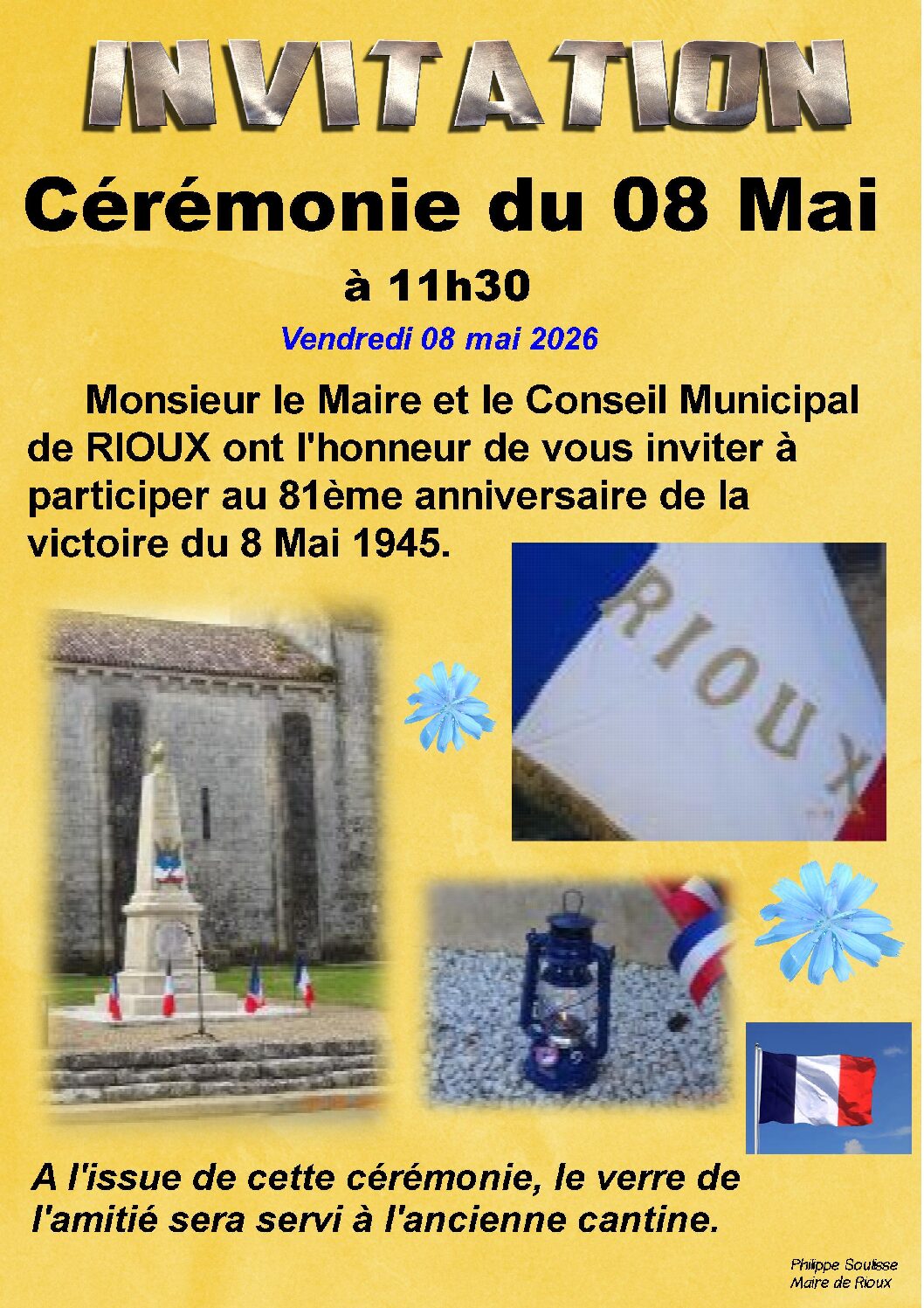 Actualités de Rioux RESE – RELEVÉ DES COMPTEURS À RIOUX INFORMATION SDIS DU 21 AVRIL 2026 – INTERDICTION DE FAIRE DU FEU CINÉ CLUB GÉMOZAC – FILM LE GRAND CHARIOT LE 24 AVRIL 2026 MAISONS PAYSANNES DE FRANCE – SORTIE À RÉTAUD LE DIMANCHE 26 AVRIL 2026 RÉUNION DU CONSEIL MUNICIPAL LE LUNDI 20 AVRIL 2026 APPARTEMENT COMMUNAL À LOUER À RIOUX VILLE À JOIE SAMEDI 25 AVRIL 2026 À RIOUX DON DU SANG À GÉMOZAC LE 13 MAI 2026 CHAT PERDU – RECHERCHE PROPRIÉTAIRE ! ENEDIS – COUPURE DE COURANT LE 15 AVRIL 2026 (suite) ENEDIS – COUPURE DE COURANT LE 15 AVRIL 2026 Voir toutes les actualités